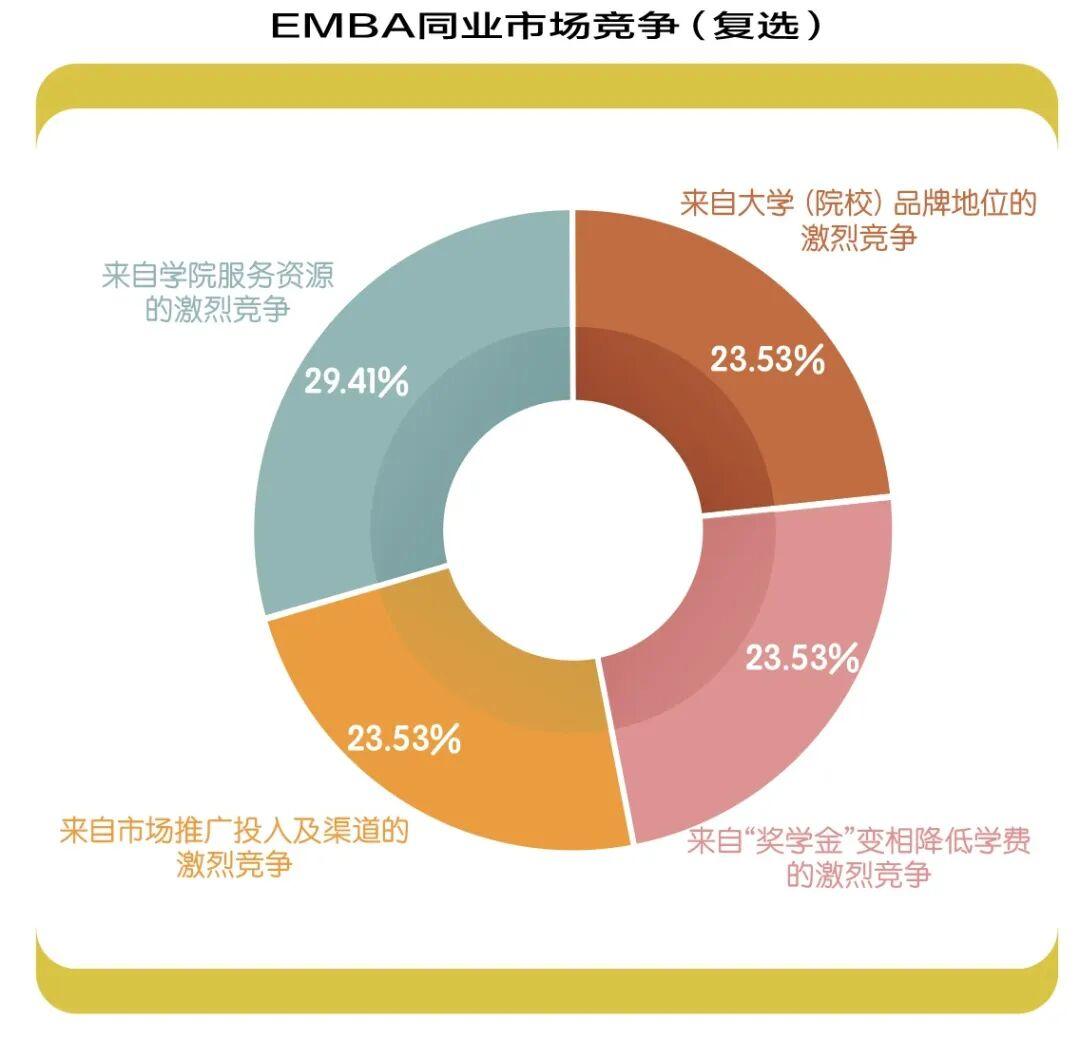 再来看“EMBA同业市场竞争”。大学商学院的EMBA勾选最多的选项是“来自学院服务资源的激烈竞争”,勾选率为29.41%,而“来自大学(院校)品牌地位的激烈竞争”“来自‘奖学金’变相降低学费的激烈竞争”“来自市场推广投入及渠道的激烈竞争”的勾选率均为23.53%。