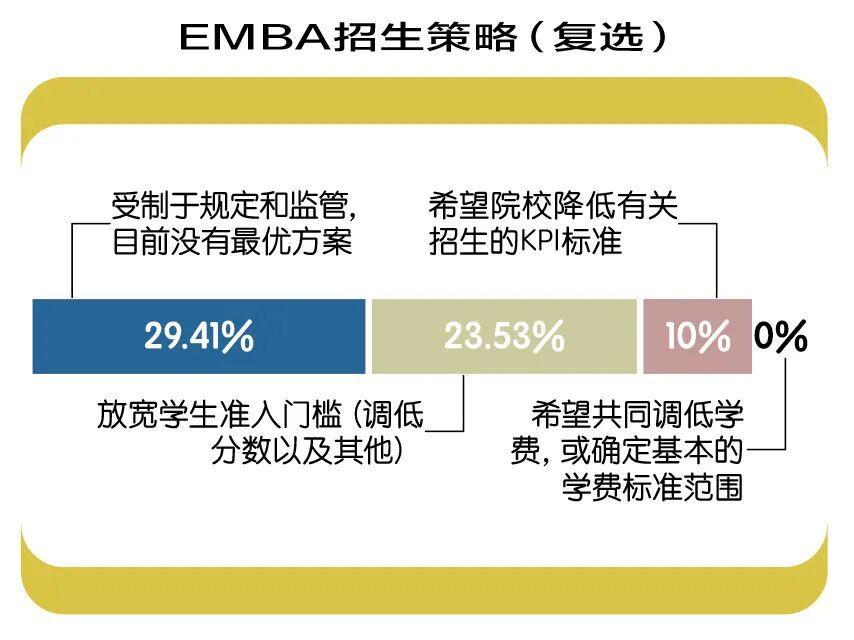 最后,看“EMBA招生策略”。大学商学院的EMBA勾选最多的选项是“受制于规定和监管,目前没有最优方案”,为29.41%;其次是“(希望)放宽学生准入门槛(调低分数以及其他)”,为23.53%;再是“希望院校降低有关招生的KPI标准”,为10%;在“希望共同调低学费,或确定基本的学费标准范围”选项上,没有任何勾选。
