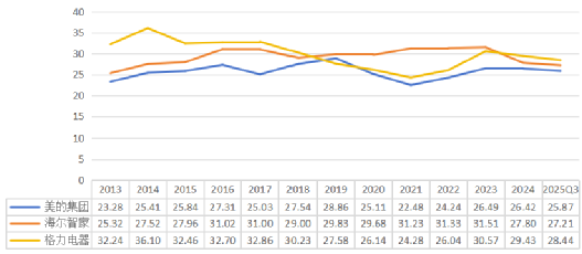 毛利率方面,格力电器前三季度为28.44%,同比2024年有所下降,且近两年皆呈现下滑趋势。