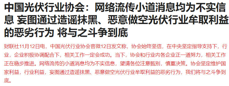 昨晚光伏反内卷被造谣,今天光伏行业协会辟谣。