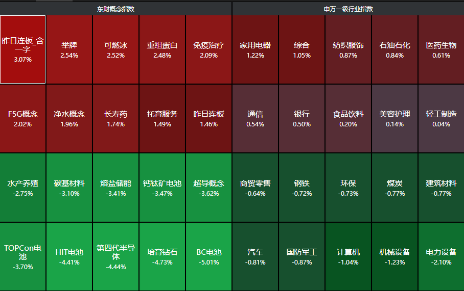 分行业来看,家用电器、综合、纺织服饰、石油石化、医药生物等行业领涨,电力设备、机械设备、计算机等行业领跌。