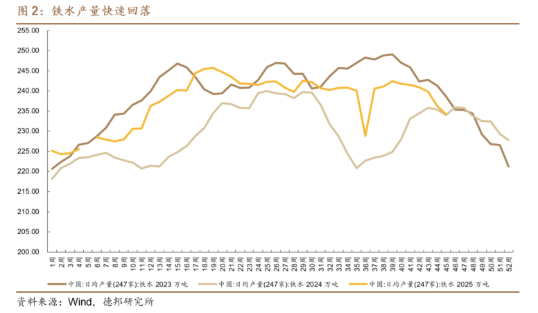 双焦期货大跌,铁水产量快速回落。今日双焦期货价格大跌,我们认为或因需求端相对偏弱导致。从需求端情况来看,钢厂铁水产量连续两周回落,近期快速下降至去年同期水平,或因钢厂补库周期结束,且近期钢价维持偏弱走势,螺纹钢期货主力合约维持3000元附近低位震荡,钢厂补库积极性或从“主动补库”转为“按需采购”。