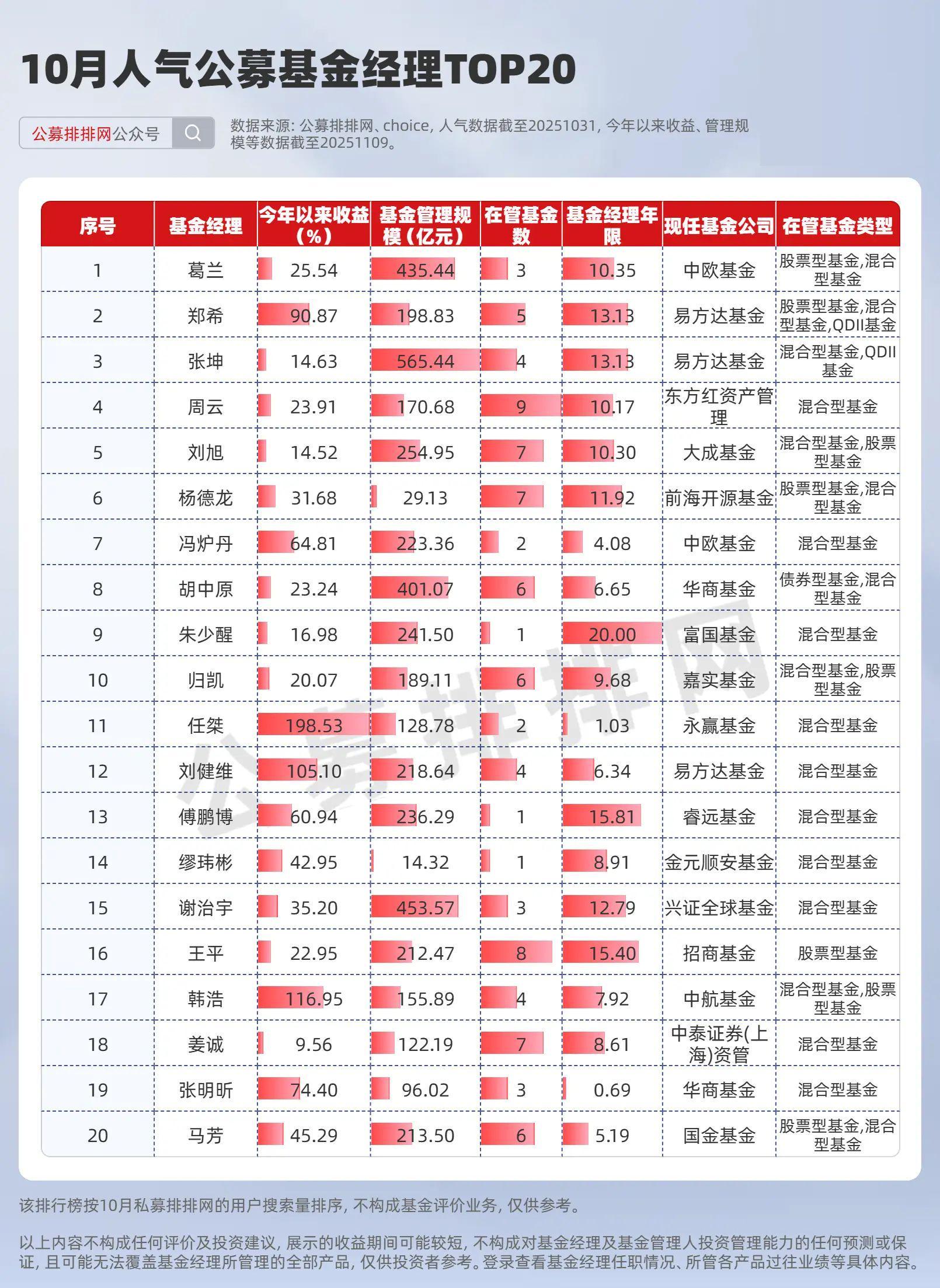 人气基金经理:中欧基金葛兰第1!易方达郑希、张坤位居前3