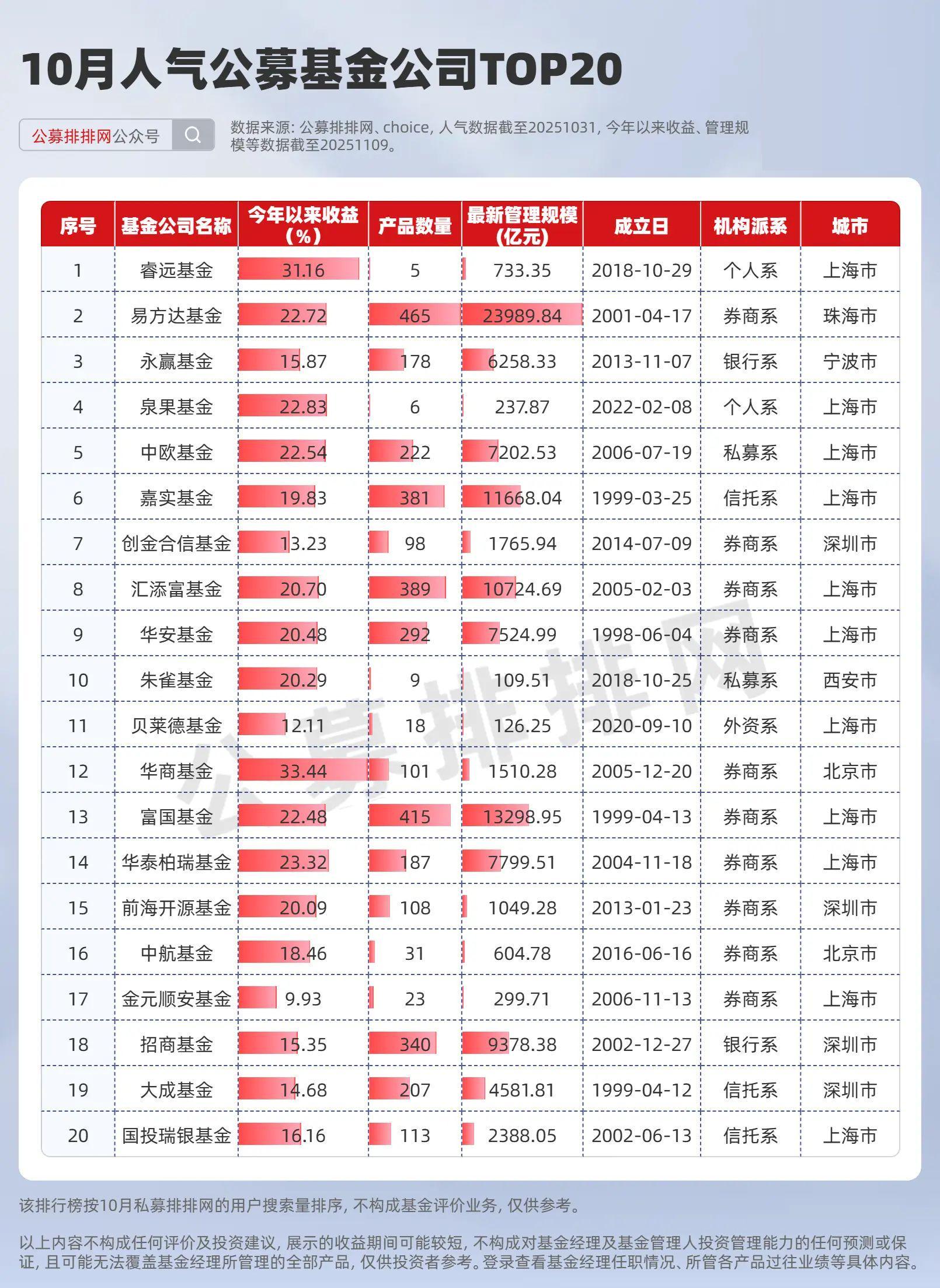 人气公募公司:睿远基金夺得第1!易方达、永赢分居第2、3名