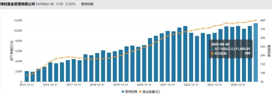 不过2024年末博时基金债券型产品达到4490.53亿元历史峰值后,2025年一季度规模缩水近400亿,好在后续稳步回血,截至三季度末规模回升至4305.15亿元,在债券基金规模中排名第二,仅略低于易方达基金的4323.59亿元。