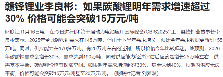 赣锋锂业董事长李良彬表示,若明年碳酸锂需求增速超30%,价格可能突破15万元/吨。受此提振,碳酸锂期货涨停,A股锂矿板块暴涨,盛新锂能、融捷股份涨停,天齐锂业逼近涨停。