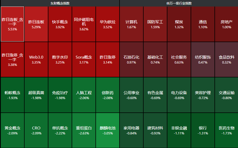 截至收盘,上证指数跌0.46%,创业板指跌0.20%,市场成交额缩量至1.93万亿;港股恒生指数跌0.71%,恒生科技指数跌0.96%。分行业看,计算机、国防军工、煤炭、通信、房地产等行业领涨,医药生物、银行、非银金融等行业领跌。