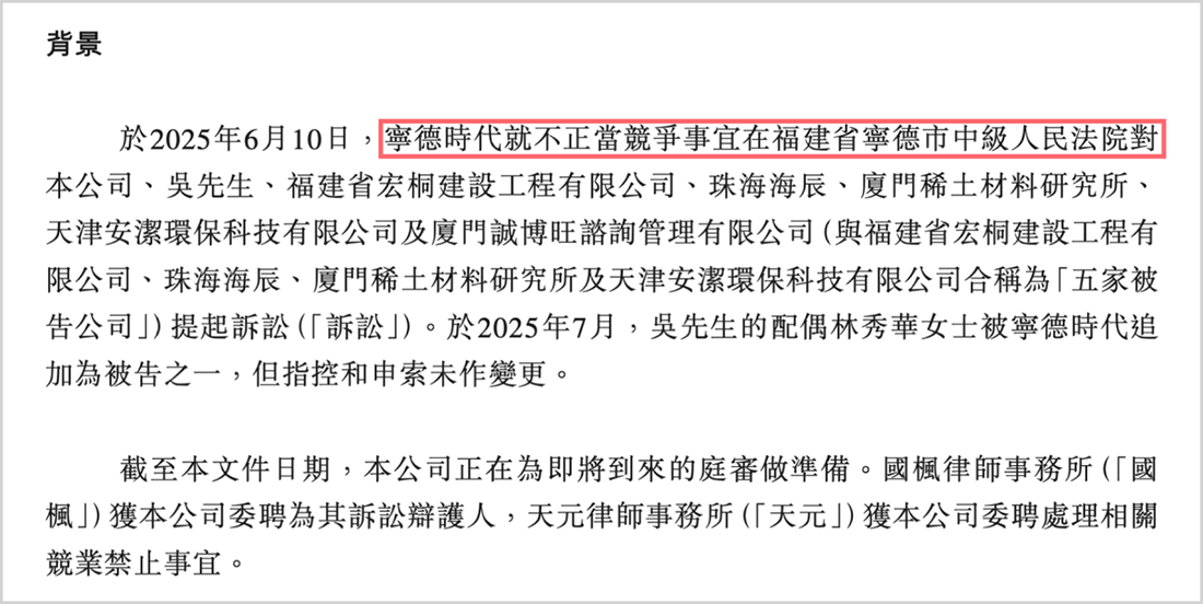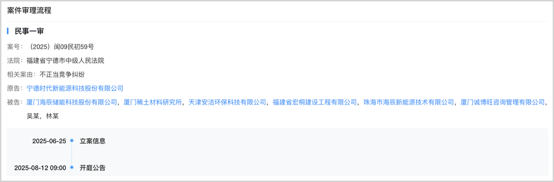 最新且金额最大的一起诉讼发生在2025年6月,宁德时代将海辰储能及厦门稀土材料研究所等6名关联方以“不正当竞争”为由告至宁德市中级人民法院。