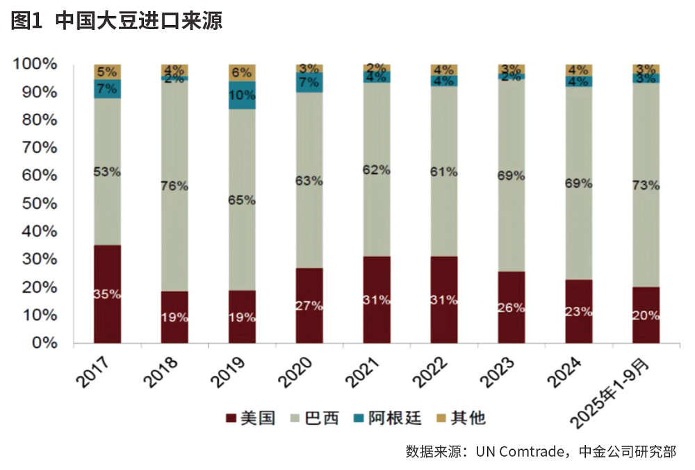 扩大农产品贸易的共识,或将增加中国进口美国的大豆。2022年以来,中国从美国进口的大豆占比呈现下降趋势,而从巴西进口的大豆占比上升。然而,美国大豆对中国的出口依存度较高。根据中金公司的测算,2025年1-9月,中国从美国进口的大豆占比为20%,较2024年的23%下降3个百分点。而2024年美国大豆出口的52%流向了中国。
