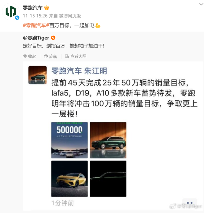11月15日,零跑汽车在官方账号发文称,2025年度累计销量已超50万台,提前完成年度销量目标。同一天,零跑汽车创始人、董事长朱江明在朋友圈写道,零跑明年将冲击100万辆的销量目标。