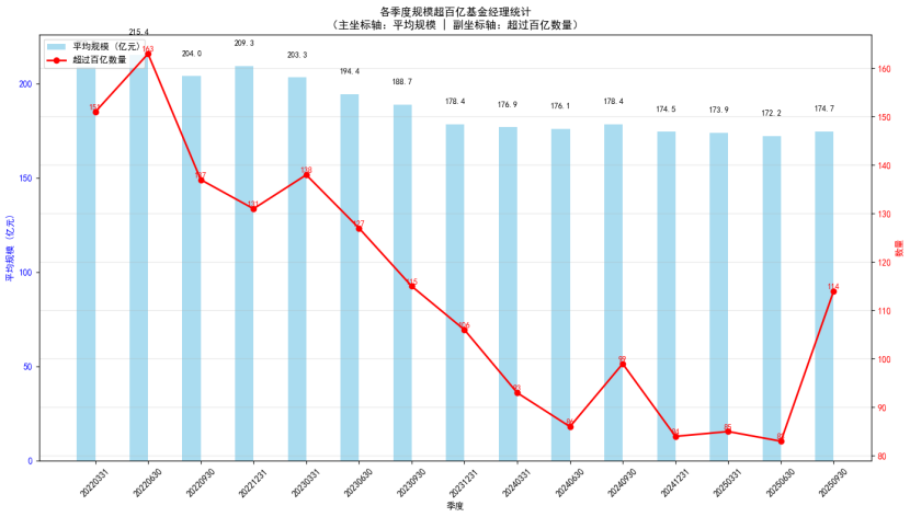 天相投顾数据显示,百亿基金经理人数在2022年一季度为151位,二季度升至163位高点,平均管理规模超200亿元。随后,受市场波动影响,这一数字持续下滑,2023年末降至106人,2024年一季度跌破100,至2025年二季度末仅剩82人。然而,从今年三季度开始,随着市场情绪回暖,百亿基金经理人数重新站上100位,截至目前约114名,平均管理规模174.7亿元。
