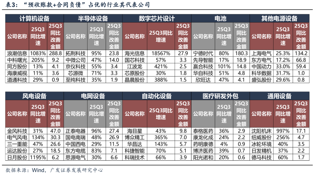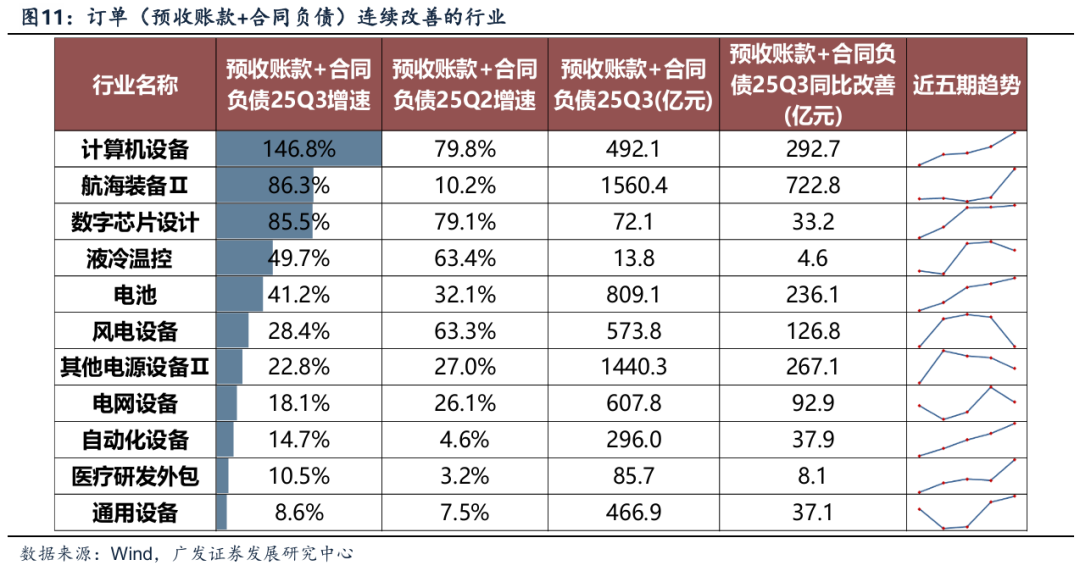 广发证券筛选出近几个季度订单增速连续改善、25Q3订单增速同比高增、公司验证情况较好的行业。类比一季度筛选,都取得了不错的超额收益。本次广发筛选的订单改善行业包括:计算机设备、船舶、数字芯片设计、液冷温控、电池、风电设备、半导体设备、其他电源设备、电网设备、自动化设备、CXO、通用设备等以及具体个股。