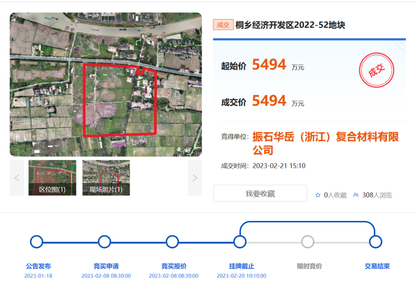 2023年2月21日,桐乡经济开发区2022 - 52地块(工业用地)被振石华岳(浙江)复合材料有限公司(下称振石华岳)以5494万元的价格摘得。振石华岳的股东为振石股份子公司振石集团华美新材料有限公司(下称振石华美),振石华岳实为振石股份的孙公司。