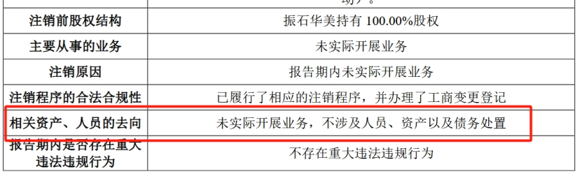 振石股份在招股书中解释注销振石华岳的原因是报告期内未实际开展业务,不涉及人员、资产以及债务处置。