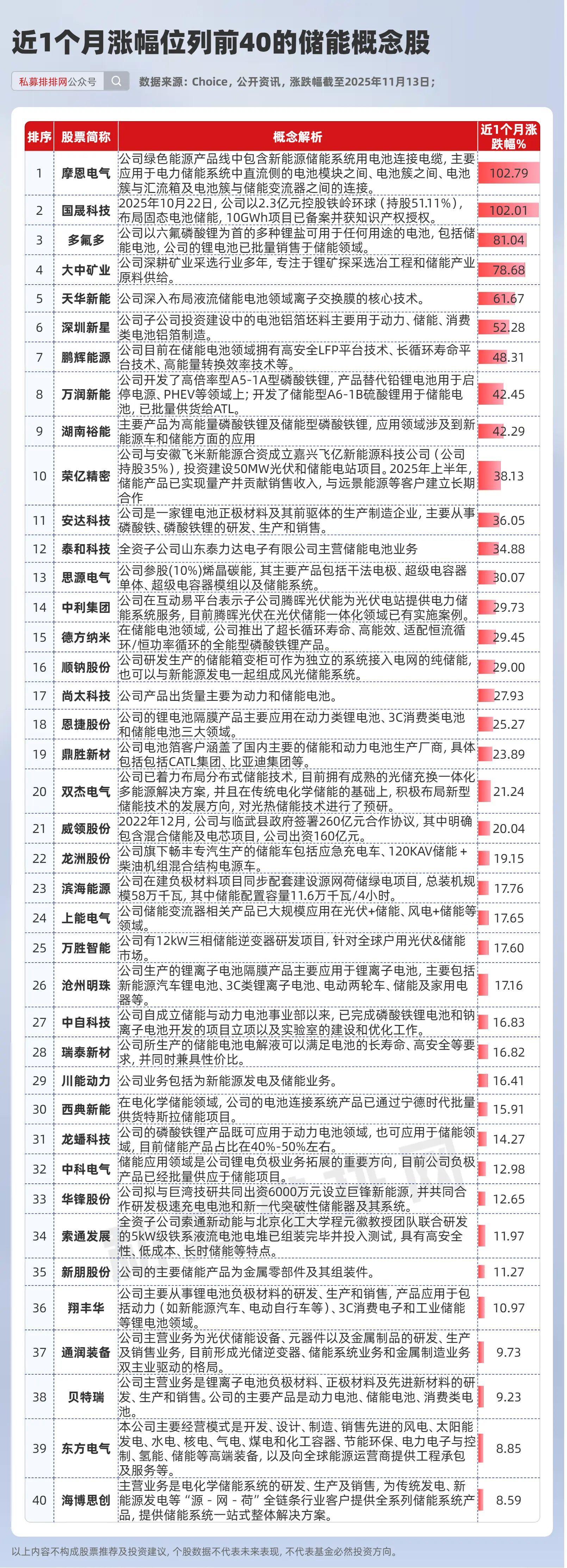 为了帮助投资者更好地把握新型储能概念的投资机会,笔者整理了近1个月涨幅居前40的新型储能概念核心A股公司,供大家参考。
