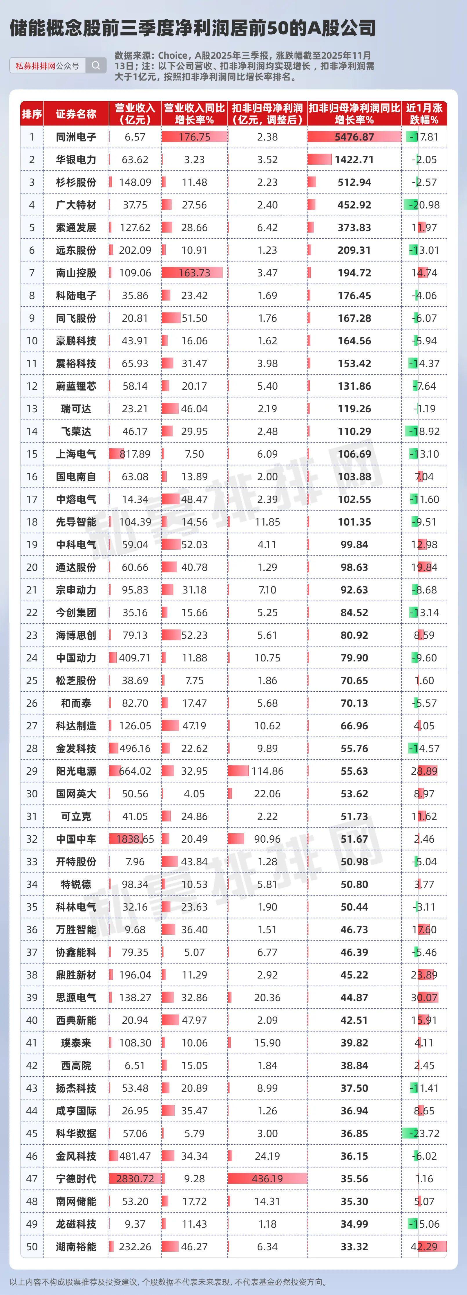 在此基础上,笔者为大家筛选出2025年前三季度扣非净利润位居前50的储能概念A股公司,供大家参考。其中,同洲电子扣非净利润增长率位居首位,达到54.77倍。(点此领取名单)