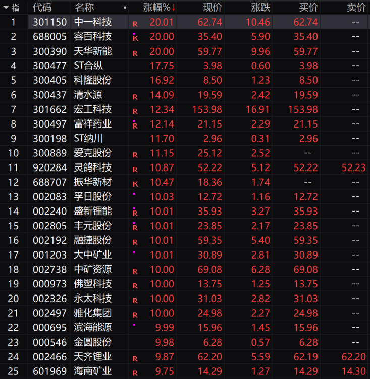 早盘阶段,锂电池概念股集体走强,截至收盘,板块内23股涨停或涨超10%。其中,容百科技、中一科技、天华新能实现20%涨停,ST合纵、科隆股份、清水源、宏功科技等涨超10%,孚日股份、盛新锂能、丰元股份、大中矿业、中矿资源、佛塑科技、永太科技等个股涨停。