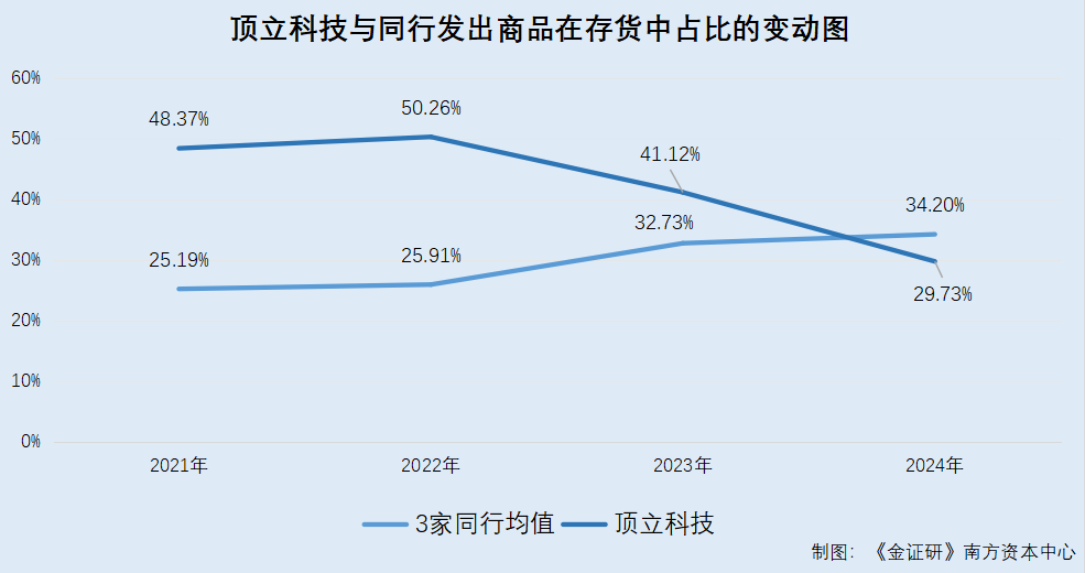 2021-2024年,顶立科技3家同行存货中发出商品的占比均值分别为25.19%、25.91%、32.73%、34.2%