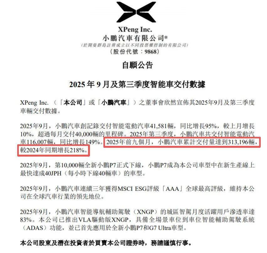 就在刚刚,小鹏汽车发布了最新三季报。数据显示,今年前9个月,小鹏汽车累计交付量达到31.32万辆,同比增长218%。平均下来,几乎每个月都卖出接近3.5万辆,这样的成绩在新能源汽车市场中已属相当亮眼。