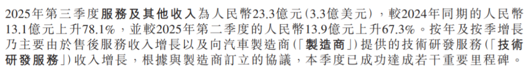 是什么把小鹏汽车的整体毛利率拉到这么高?答案是“服务及技术研发收入”。三季度,这部分收入达到了23.3亿,同比增长78.1%,估计与向大众汽车提供技术输出有关。据券商研报,这部分毛利率高达74.6%,直接拉高了整体毛利率。