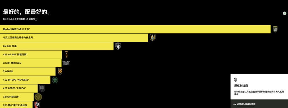 通过验证的军事单位账号可查看产品评价。第414步兵旅凭借积分优势长期占据榜首,该部队5月击中6500个目标,兑换600架“吸血鬼”无人机。
