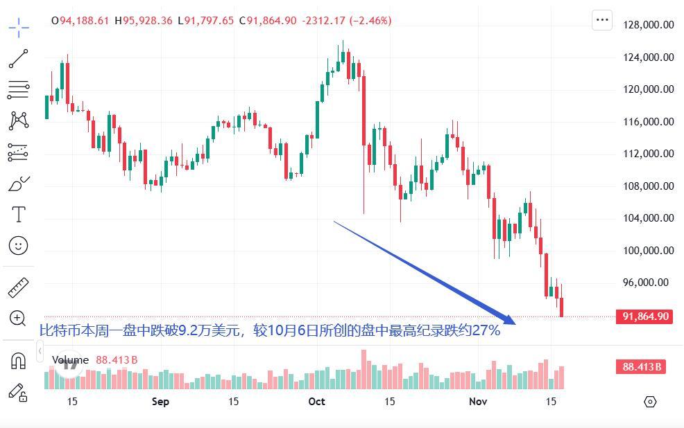 在这场巨震中,全球最大比特币持仓机构Strategy Inc.(原MicroStrategy)选择逆势加码。周一披露的文件显示,该公司在截至上周日的七天内斥资8.356亿美元购入比特币,创去年7月以来最大单周买入规模。此举使其总持仓量增至64.987万枚,按当前价格计算价值约617亿美元。然而,这一“抄底”行为并未提振市场信心——美东时间17日午盘,比特币跌破9.2万美元,创近七个月新低,较历史高点暴跌超27%,日内跌幅超4%。
