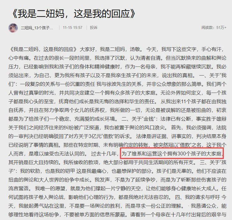 如今,徐波的“乌托邦”正面临现实崩塌。经济下行,企业收缩,他的财富已不足以支撑300个子女的抚养。据前伴侣汤敬(二妞妈)2025年11月15日公开声明,徐波通过捐精、代孕在全球生育超300名子女,组成“大型实验式家庭”。汤敬独自抚养13个孩子(2名自然生育,11名代孕),并争取另外2名女儿的抚养权;其余近300名子女由其他女性生育,徐波以“捐精协议”规避法律责任,声称不承认亲子关系。