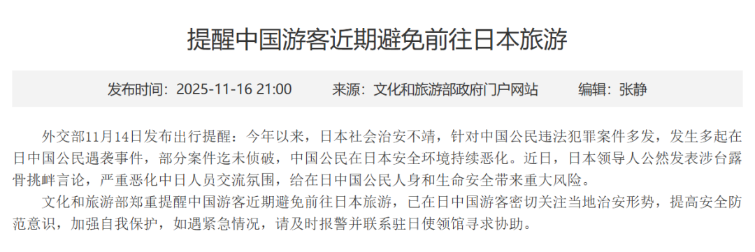 刘宇星和朋友之所以改变出游目的地,是因为她们看到了文旅部发布的中国游客近期避免前往日本旅游的提醒。文旅部在官网郑重提醒中国游客近期避免前往日本旅游,已在日中国游客应密切关注当地治安形势,增强安全防范意识,加强自我保护,如遇紧急情况,请及时报警并联系驻日使领馆寻求协助。