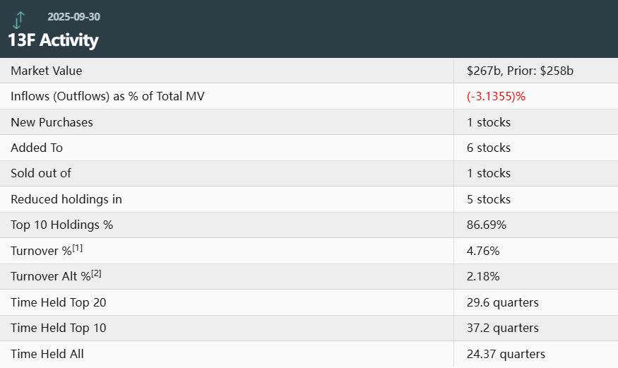 在加码科技股的同时,伯克希尔对苹果的持仓调整持续进行。三季度减持4179万股后,仍持有2.38亿股苹果股票,持仓市值约606.6亿美元。尽管减持幅度达14.92%,苹果仍以22.7%的占比稳居其第一大重仓股位置。此外,美国银行(BAC)也遭遇3720万股的减持,持仓占比从11.12%降至10.96%,位列第三大重仓股。