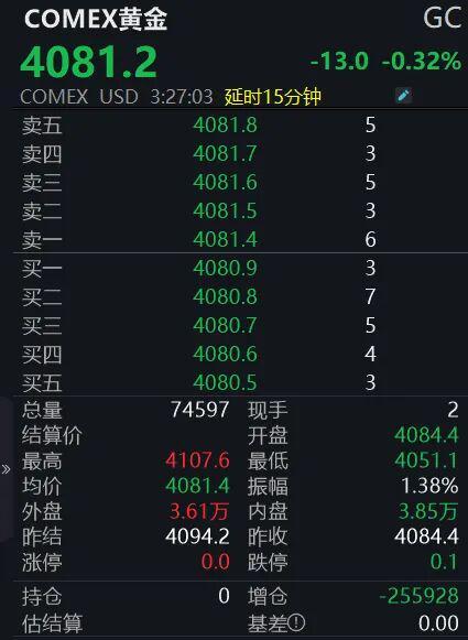 期货市场同样表现疲软。COMEX黄金期货盘中出现跳水行情,截至发稿时日内跌幅达0.32%,报4081.2美元/盎司,盘中最低触及4051.1美元/盎司,显示出市场对黄金的短期看空情绪。