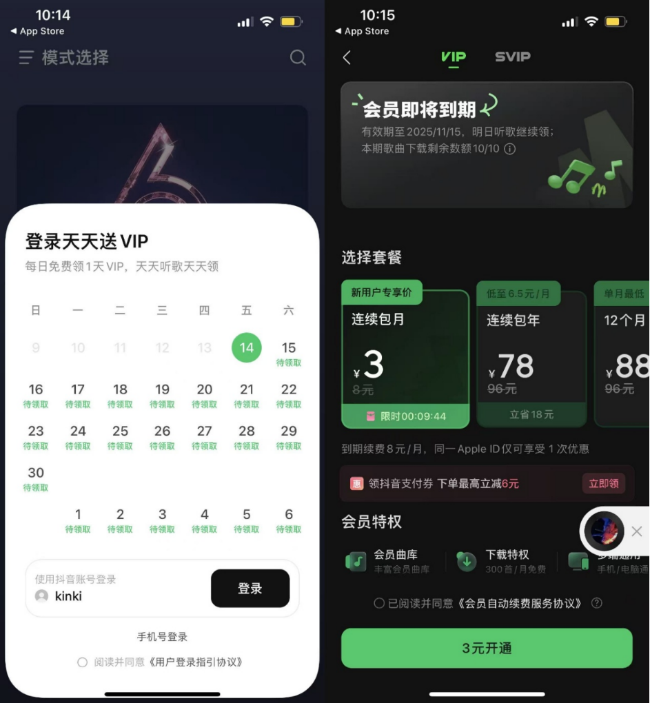 在商业模式设计上,汽水音乐采取“免费+轻付费”策略:用户通过每日登录即可领取会员,付费会员价格与行业持平但取消“套娃式收费”。小红书用户“牛魔王”的案例颇具代表性:“原来QQ音乐月VIP15元+数字CD30元才能听朴彩英专辑,现在汽水音乐打卡就能免费听。”这种“降维打击”直接冲击着传统平台的付费体系。