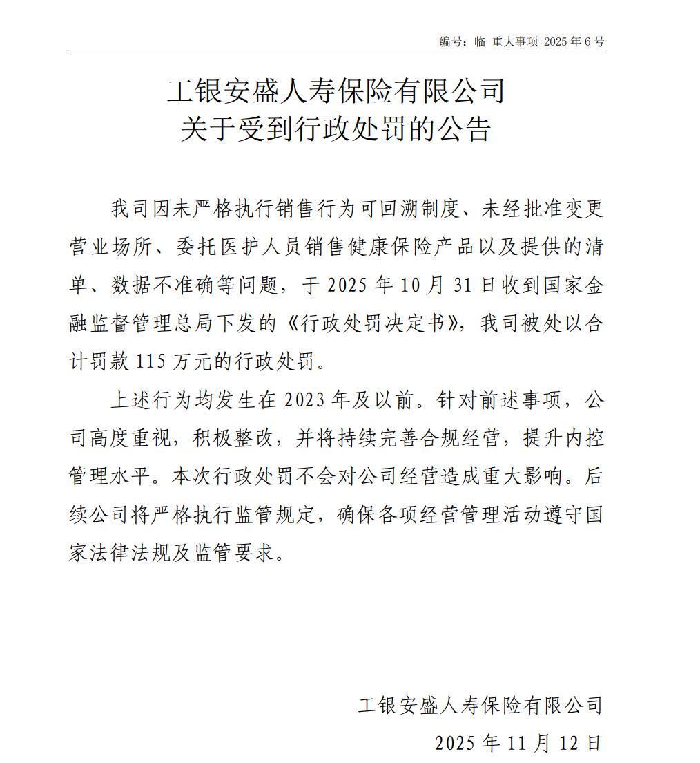 2025年11月12日,工银安盛人寿在官网披露了一则重大事项公告。公告显示,公司因未严格执行销售行为可回溯制度、未经批准变更营业场所、委托医护人员销售健康保险产品以及提供的数据不准确等问题,于2025年10月31日收到国家金融监督管理总局下发的《行政处罚决定书》,被处以合计115万元的罚款。