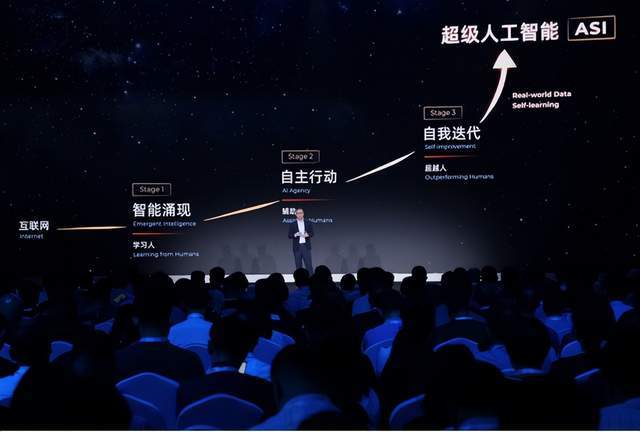 AI技术已深度渗透C端市场。CNNIC《生成式人工智能应用发展报告(2025)》显示,截至2025年6月,中国生成式AI用户规模达5.15亿,超三分之一网民使用过AI应用,且“多数用户偏好国产模型”。对大众而言,AI已从社交话题转化为实用工具,用于写邮件、做报表、查攻略等场景。这一趋势与阿里巴巴的长期判断一致:在2025年云栖大会上,吴泳铭提出通用人工智能(AGI)是起点,终极目标是发展出能自我迭代的超级人工智能(ASI),并将其演进路线分为三阶段: