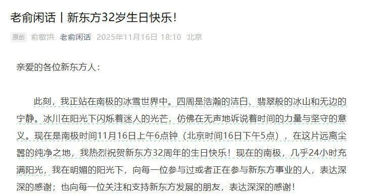 信中,俞敏洪描述道:“此刻,我正站在南极的冰雪世界中。四周是浩瀚的洁白、翡翠般的冰山和无边的宁静。冰川在阳光下闪烁着迷人的光芒,仿佛在无声地诉说着时间的力量与坚守的意义。现在是南极时间11月16日上午6点钟(北京时间16日下午5点),在这片远离尘嚣的纯净之地,我热烈祝贺新东方32周年的生日快乐!”