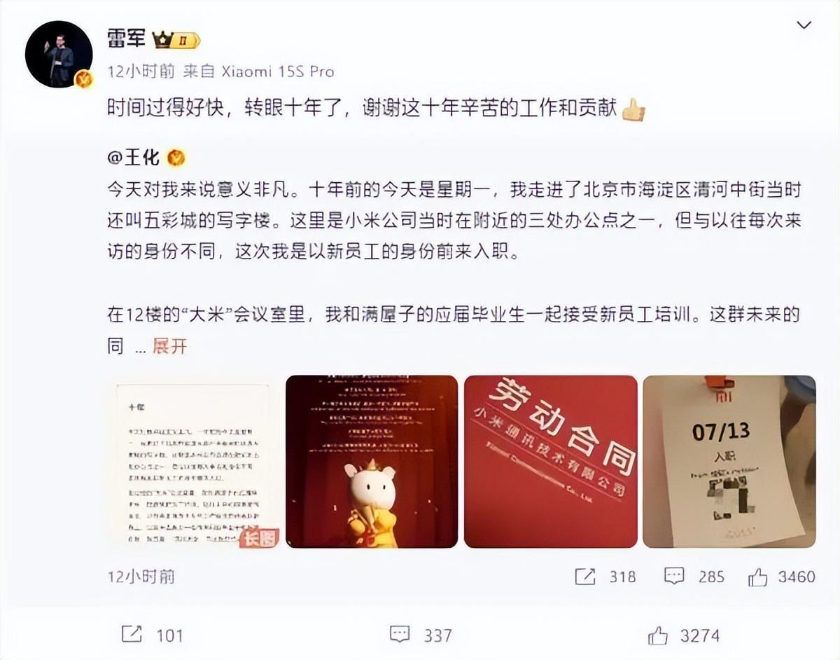 王化回忆称,2015年的小米尚未设立独立的公关部,他加入的小米网大市场部承载了公司全部销售体系,可视为如今小米集团中国区的前身。十年间,小米员工数量从四五千人增长至超六万人,组织架构也发生了巨大变化。小米创始人雷军转发并评论了王化的这条微博,表示:“时间过得好快,转眼十年了,谢谢这十年辛苦的工作和贡献。”