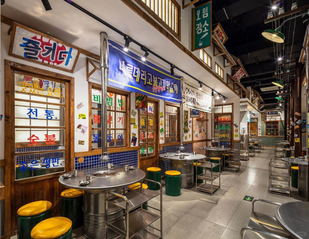 门店装修上,为了营造“不用出国就能体验韩剧场景”的氛围,铁桶、霓虹灯、海报成了每个韩式烤肉店的“标配”,大屏幕上要么放着热播韩剧,要么循环播放当红韩国偶像的单曲MV,部分门店还安排了身着韩服的服务员。