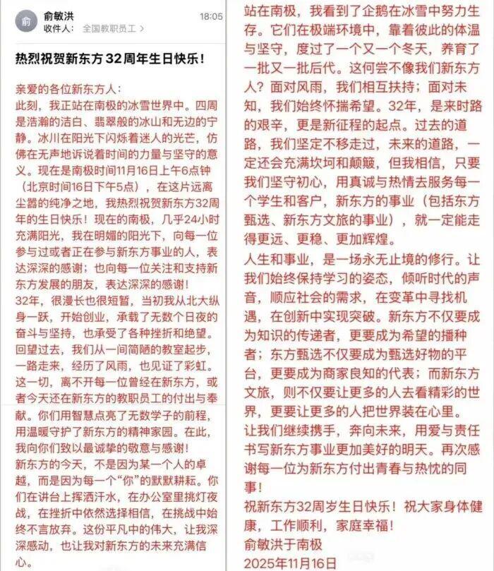 这场风波的导火索是俞敏洪在新东方32周年之际发布的一封内部信。信中虽然表达了感谢与共创未来的愿景,但问题在于发信人此刻正在南极旅行,信中多次提及的'极地精神'与员工们加班的现实形成强烈反差。这种时空错位让部分员工感到被冒犯,认为老板的'情怀展示'显得有些不合时宜。
