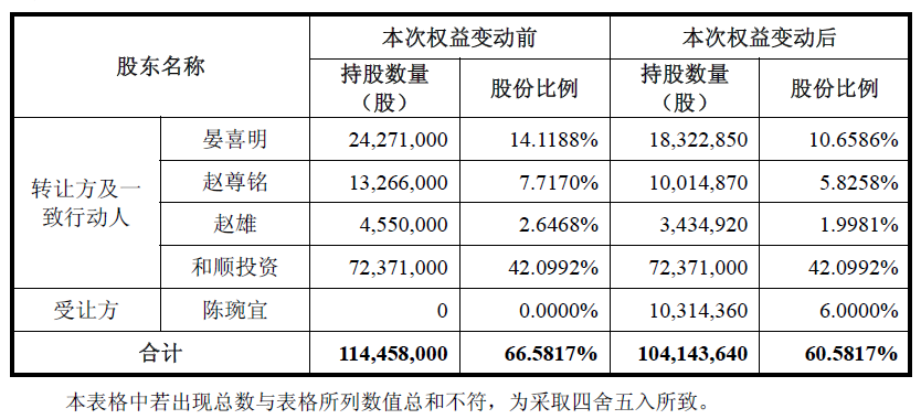 此次权益变动后,公司控股股东和顺投资、实际控制人晏喜明、赵尊铭及其一致行动人赵雄合计持有公司1.04亿股股份,占公司股份总数的60.5817%。交易完成后,陈琬宜将持有公司6%的股份。
