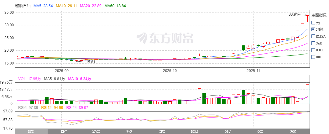 消息一出,11月17日,公司股价毫无疑义直接一字涨停,到了今日则涨停开盘,盘中炸板后重回涨停。而就在上述协议签署当天的11月14日,和顺石油股价在低开0.98%后迅速拉升涨停,全天成交6204万元,最高封单额8783.59万元。从今年10月开始,公司的股价已经从16元左右,一路涨破33元,显著高于奎芯科技董事长陈琬宜22.932元/股的受让价格。