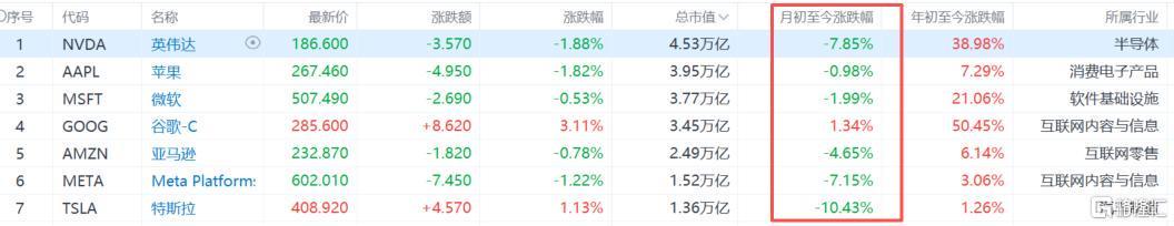 数据显示,科技股此前强劲表现推动标普500指数从4月低点至10月高点累计上涨38%。然而,本月以来,美股“七巨头”涨势停滞,特斯拉累计跌幅超10%,Meta与英伟达均跌超7%,仅谷歌母公司Alphabet逆势上涨。