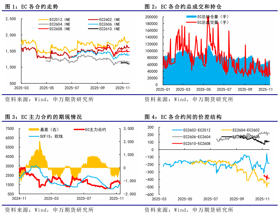 后市来看,由于2026年春节假期影响,02合约的最后交易日为2026年2月9日,对应计入的交割结算价分别是2026年2月9日、2月2日和1月26日。由于尚未计价到春节后的运价情况,02合约估值提升,与12合约价差收窄至50-100点。目前在马士基带头调降下,11月下半月挺价预期证伪,现货装载压力偏大的OOCL和PA联盟基本已跟降,MSC则在最初开舱就偏低,预计11月下半月大柜均价仅略高于11月上半月,在2200-2300美元左右。目前12月上半月挺价尚未证伪,挺价落地程度可以重点关注这周马士基的开舱情况。由于今年春节偏晚,12月下半月及1月存在春节前的抢运预期,整体02合约估值抬升,但船司运力调控有限,02合约预计空间有限,需关注后续挺价落空后的运价拐点。