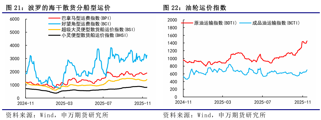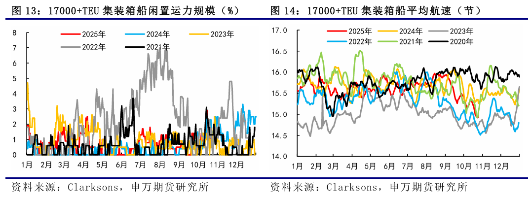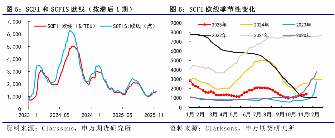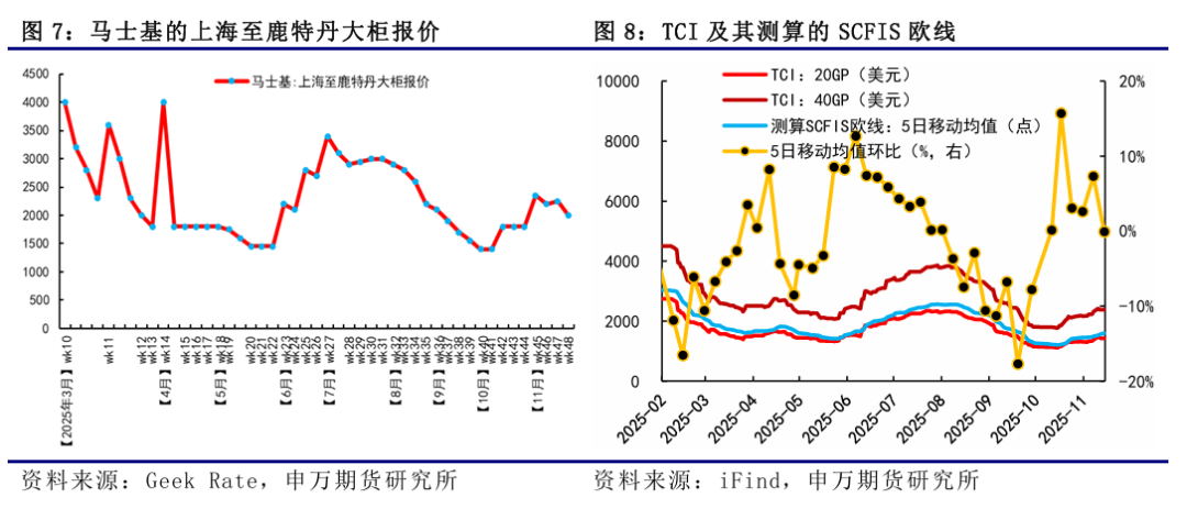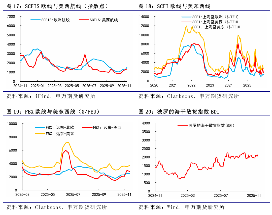 后市来看,由于2026年春节假期影响,02合约的最后交易日为2026年2月9日,对应计入的交割结算价分别是2026年2月9日、2月2日和1月26日,由于尚未计价到春节后的运价情况,02合约估值提升,与12合约价差收窄至50-100点。目前在马士基带头调降下,11月下半月挺价预期证伪,现货装载压力偏大的OOCL和PA联盟基本已跟降,MSC则在最初开舱就偏低,预计11月下半月大柜均价仅略高于11月上半月,在2200-2300美元左右。目前12月上半月挺价尚未证伪,挺价落地程度可以重点关注这周马士基的开舱情况,由于今年春节偏晚,12月下半月及1月存在春节前的抢运预期,整体02合约估值抬升,但船司运力调控有限,02合约预计空间有限,关注后续挺价落空后的运价拐点。
