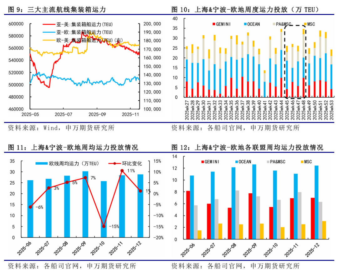 根据上海&宁波&青岛(AE5/NE4)-欧基港的船期统计情况来看,11月和12月整体运力投放持续回升,周均计划运力回到28万TEU之上。11月上半月周均运力投放在26万TEU,下半月运力投放增加,周均计划运力投放增至30万TEU左右,且第47周和第48周逐周增加,第48周计划运力投放增至34万TEU之上,这也很大程度上增加了下半月船司挺价压力,对应于马士基第47周和第48周的低价开舱,同时对于船司12月初的涨价也带来不小的压力。12月,目前MSC的SWAN航线无船期,同时最新OA联盟的FAL7航线也在达飞官网尚未有船期,若假设这两条航线均在12月停航,12月周均计划运力仅小幅增长至28.79万TEU。从节奏上来看,12月上半月运力投放尚可,周均计划运力在26万TEU左右,但下半月运力投放增加,第51周和第52周运力投放均在33万TEU之上,运力投放相对较为充足,或增加12月下半月船司挺价压力,关注后续船期变化。