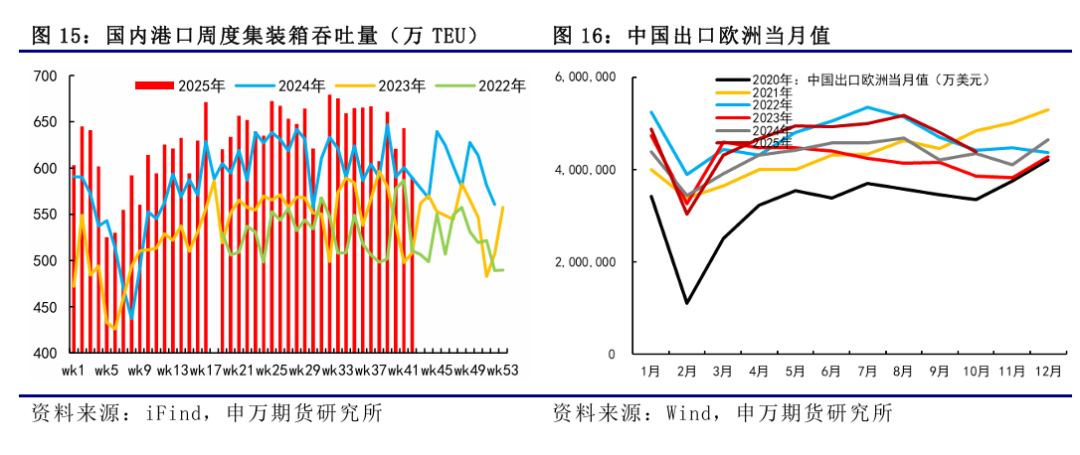 欧线需求延续往年季节性表现。通常来说,10月至12月期间通常对应着运价的上行期,从需求的表现来看,10月起揽货压力通常会有所下降,船司也会逐渐为年底旺季挺价蓄力,但10月可能还是对应着季节性的需求淡季,到了11月、12月通常需求会有所好转。第45周国内港口集装箱吞吐量为680.9万TEU,环比上涨0.58%。宏观经济方面,10月份我国出口同比下降1.1%,进口同比增长1%,其中对欧盟出口同比增速明显回落,由9月的14.18%降至0.92%,从出口的季节性来看,回落程度要高于往年,一定程度上或与10月份中欧贸易摩擦有所升级有关。