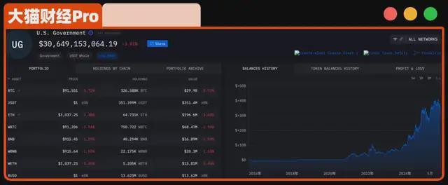 区块链分析显示,一个被标记为“美国政府”的钱包自2021年起资产暴增,当前持有价值306.5亿美元的加密货币(约合2200亿人民币),其中96%为比特币。被没收的12.7万枚比特币,占其比特币资产的40%。