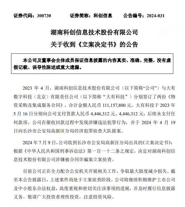 除信披问题外,科创信息还面临一起超亿元合同诈骗案。公司在今年三季报中披露,在催收客户大有科技回款过程中,发现涉嫌违法犯罪行为,并于2024年4月19日向长沙市公安局高新区分局经济犯罪侦查大队报案。2024年7月9日,公司收到《立案决定书》,案件正式立案侦查。