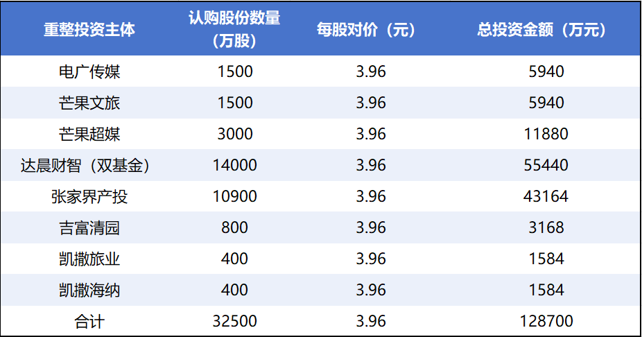 此前,张家界旅游集团已公布产业投资人名单,涵盖电广传媒(000917.SZ)、芒果文旅、芒果超媒(300413.SZ)等8家机构。这些投资人将以3.96元/股的价格认购3.25亿股,总投资约12.87亿元。与财务投资人相比,产业投资人的入股价格更低,较最新股价折让约54%。其中,湖南国资成为此次重整的核心力量。