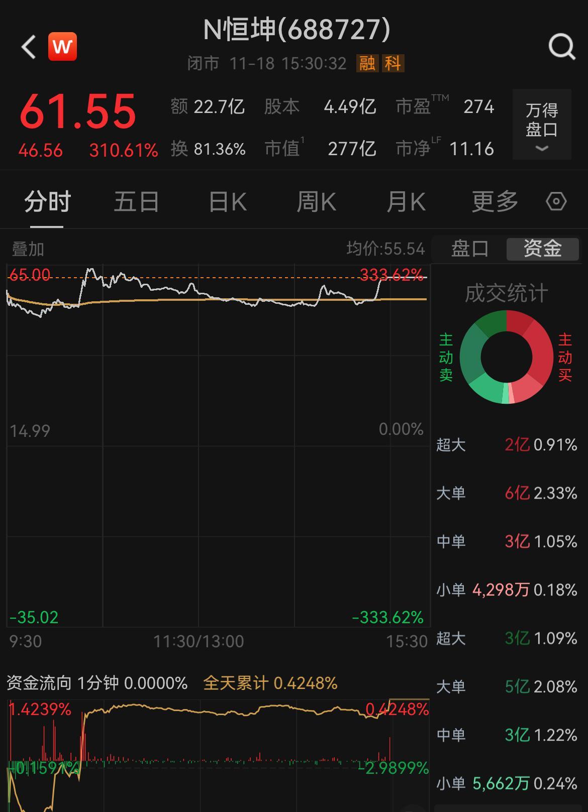 截至收盘,恒坤新材股价报收61.55元/股,涨幅高达310.61%,公司总市值也随之跃升至277亿元,成为资本市场的新焦点。