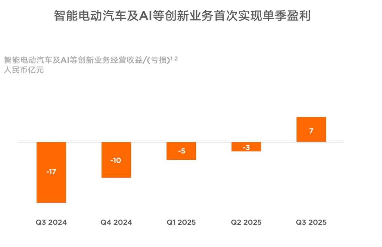 在小米集团的众多业务板块中,智能电动汽车和AI等创新业务(下称创新业务)表现尤为亮眼,成为集团内部增速最快的业务板块。今年第三季度,这一业务营收达到290亿元,同比增长199.2%;净利润7亿元,首次实现季度盈利。