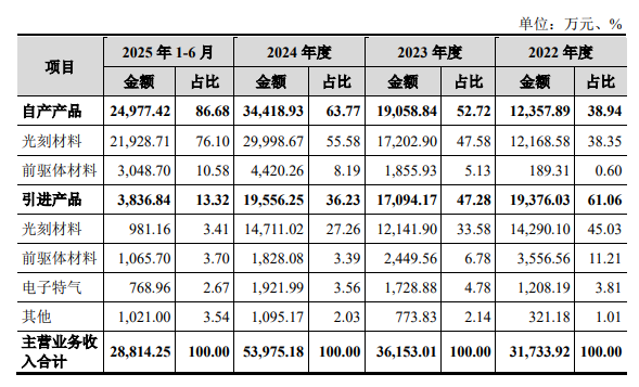 随着自产业务规模扩大,恒坤新材营收结构持续优化。2022年自产产品收入超亿元,2025年上半年自产产品占主营业务收入比例已超85%,成为核心盈利来源。